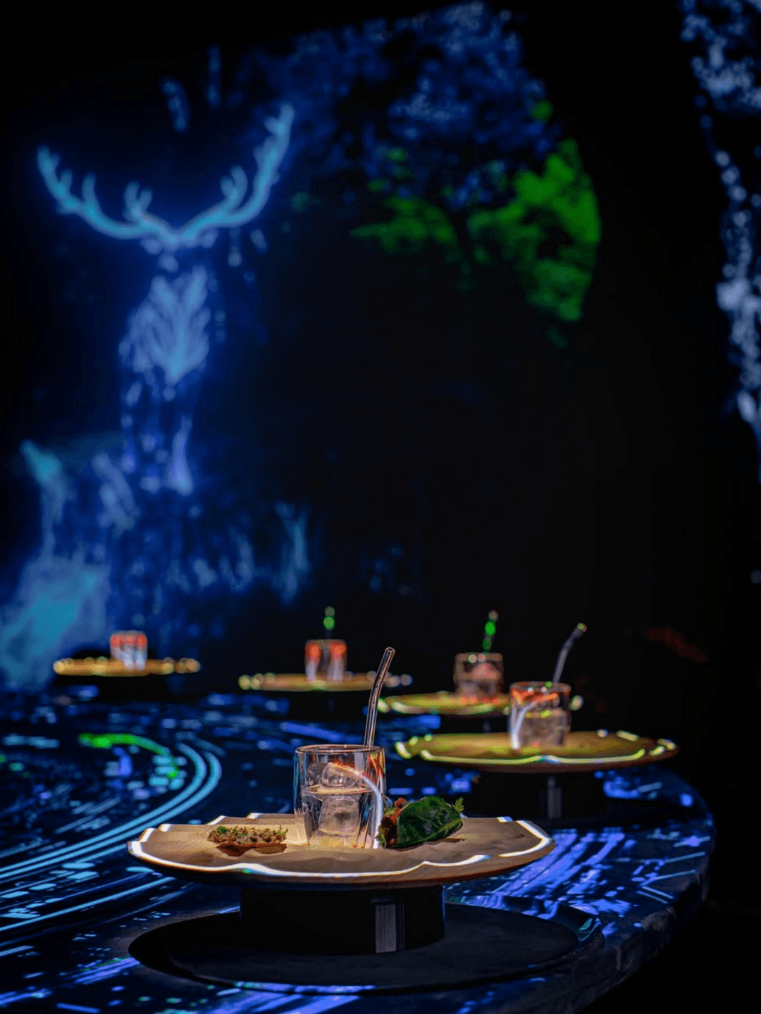 3D projections sweep across the walls, each chapter of the meal paired with its own visual narrative. One course arrives under Van Gogh’s painted skies, another unfolds against the backdrop of Parisian streets. It’s dining conceived as performance art, where cuisine, theatre, and digital design work in tandem.