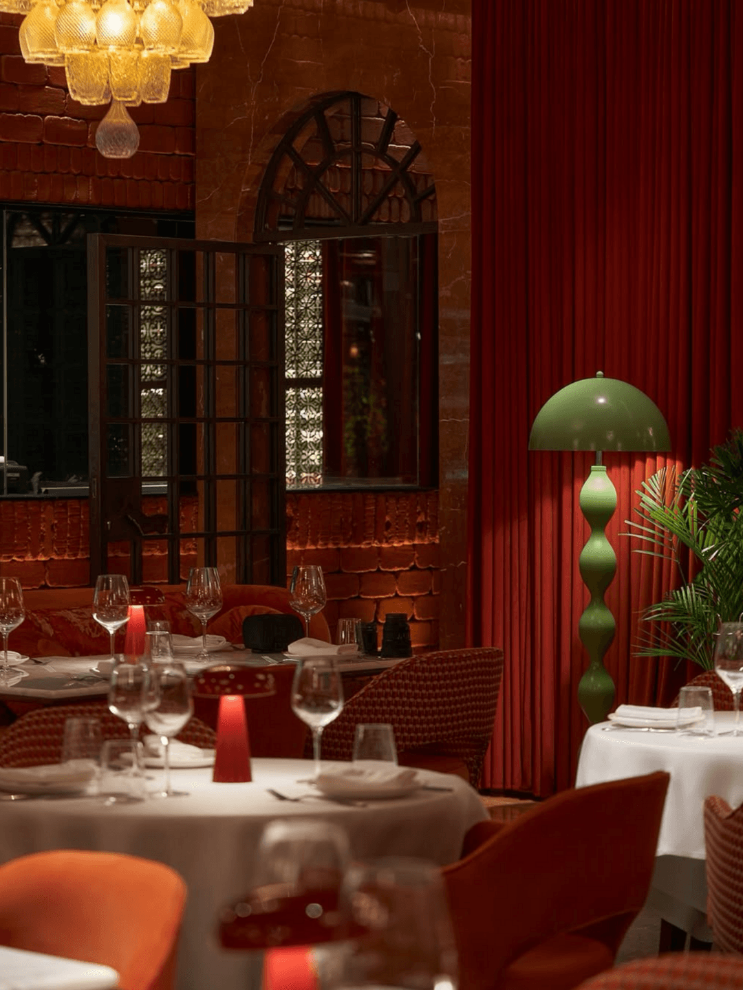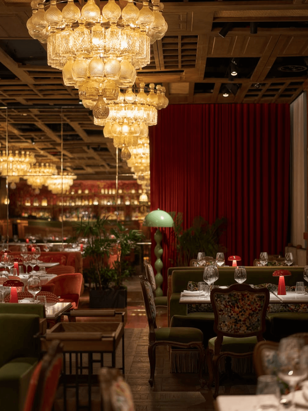 A restaurant imagined as a love story, Bisou draws its soul from the romance between a French librarian and an Arabic poet. That narrative seeps into every corner, rows of books punctuate the interiors, chandeliers shimmer like stage lights, and the mood feels deliberately theatrical, as if each table were a scene in a play. The space is layered, intimate yet dramatic, a setting where design and storytelling are inseparable.