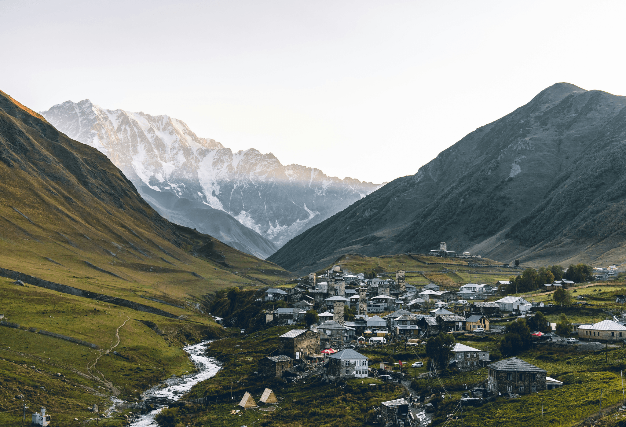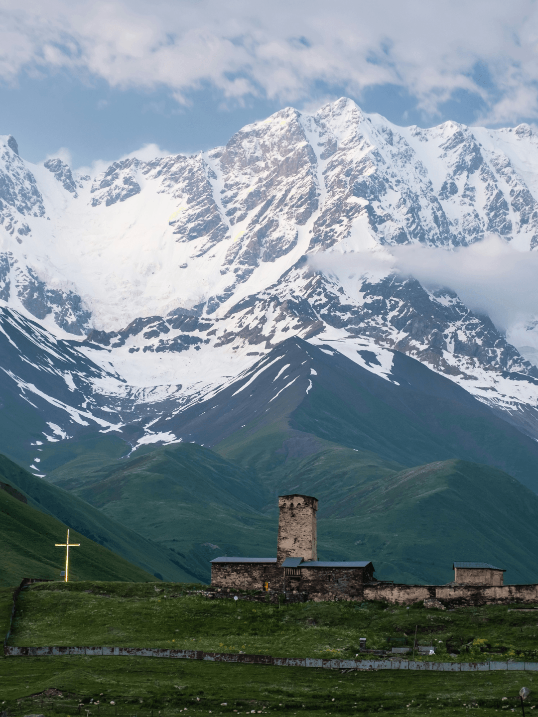 At over 2,000 meters in the Caucasus, Ushguli is one of Europe’s highest inhabited settlements. Stone defense towers rise above the clustered village, their vertical lines set against the jagged backdrop of Mount Shkhara.